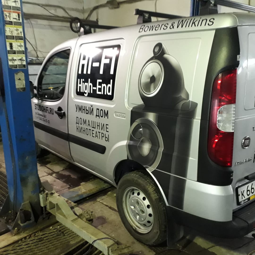 Чем ярче и индивидуальнее будет забрендирован ваш транспорт, тем эффективнее заработает реклама. В «Print Ural» разработкой и созданием передвижной рекламы занимаются только специалисты высшей квалификации, знающие все тонкости работы. Как выгодно работает креативный дизайн при брендировании, можно увидеть на примере фотографий автомобиля «Fiat» для компании «StudioHiFi.ru». В данном случае брендирование было сделано «под ключ». Такое брендирование включает в себя: создание макета, изготовление необходимых наклеек, очистку рабочей поверхности и непосредственный монтаж виниловых наклеек на нее.
