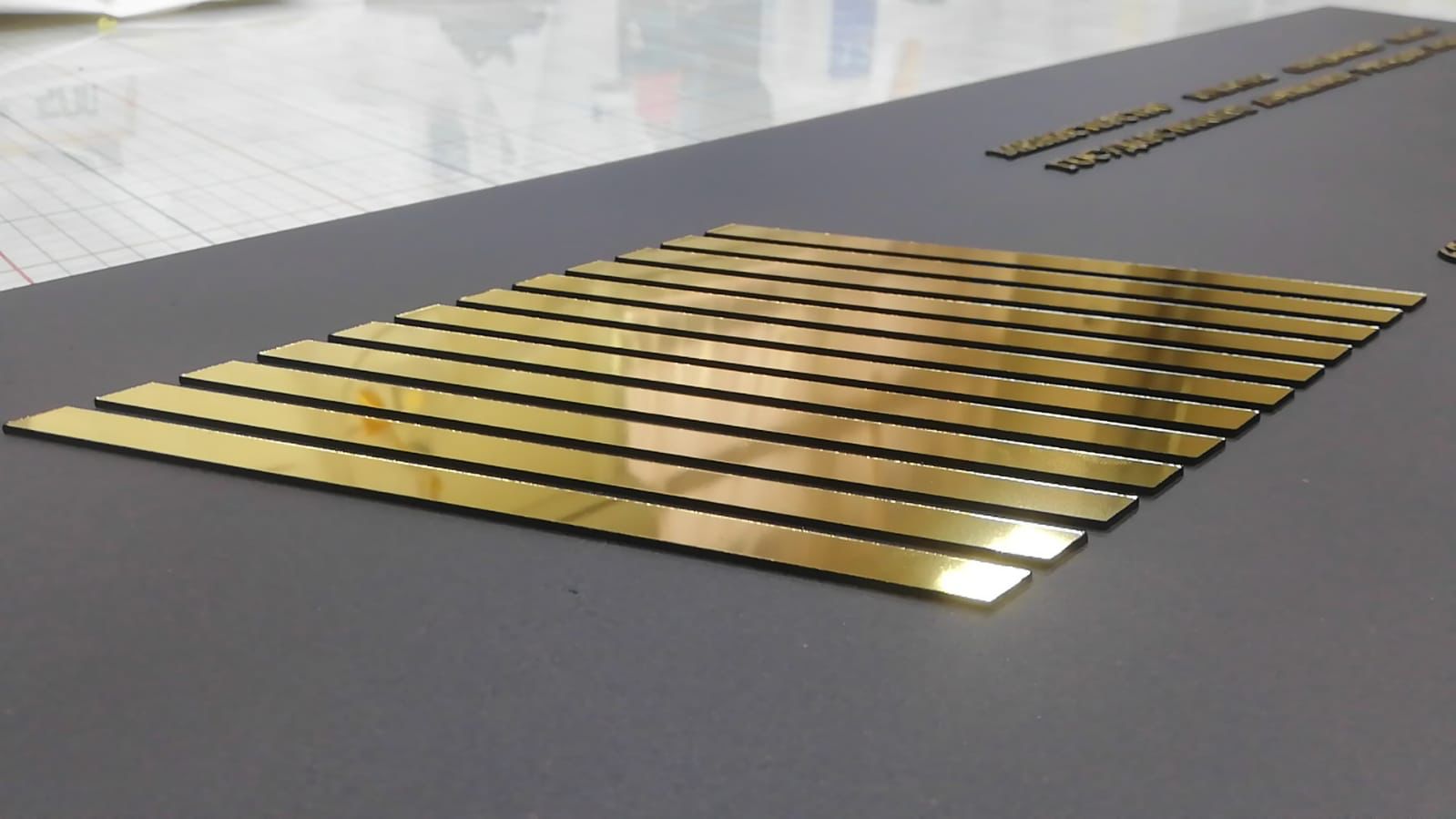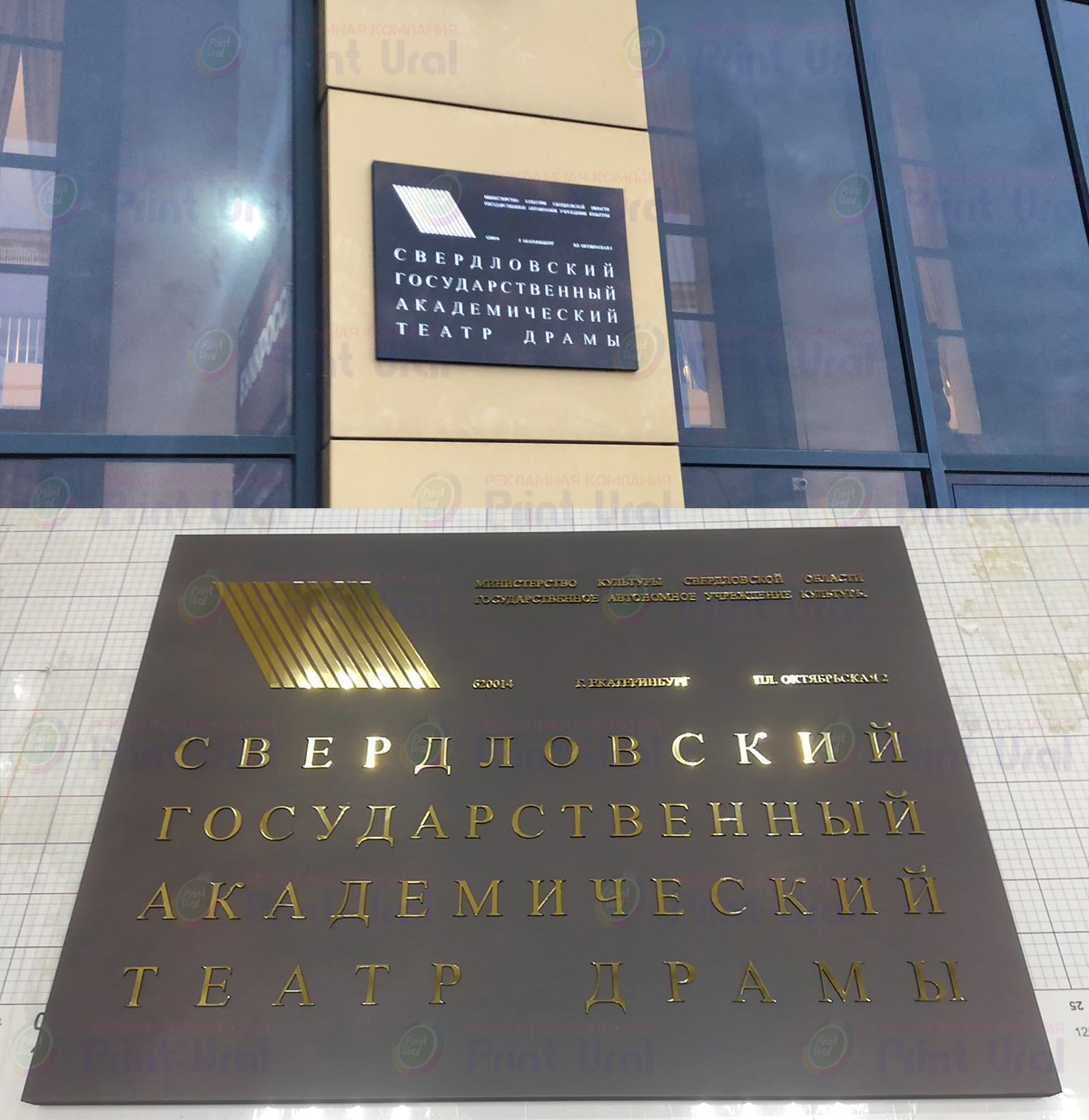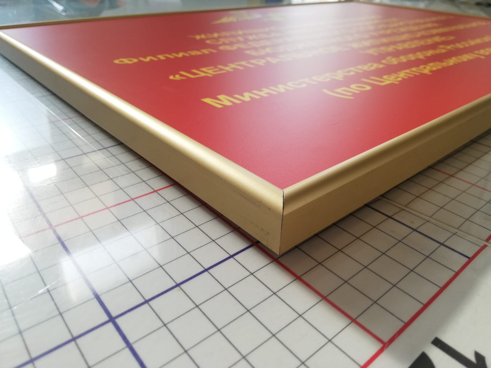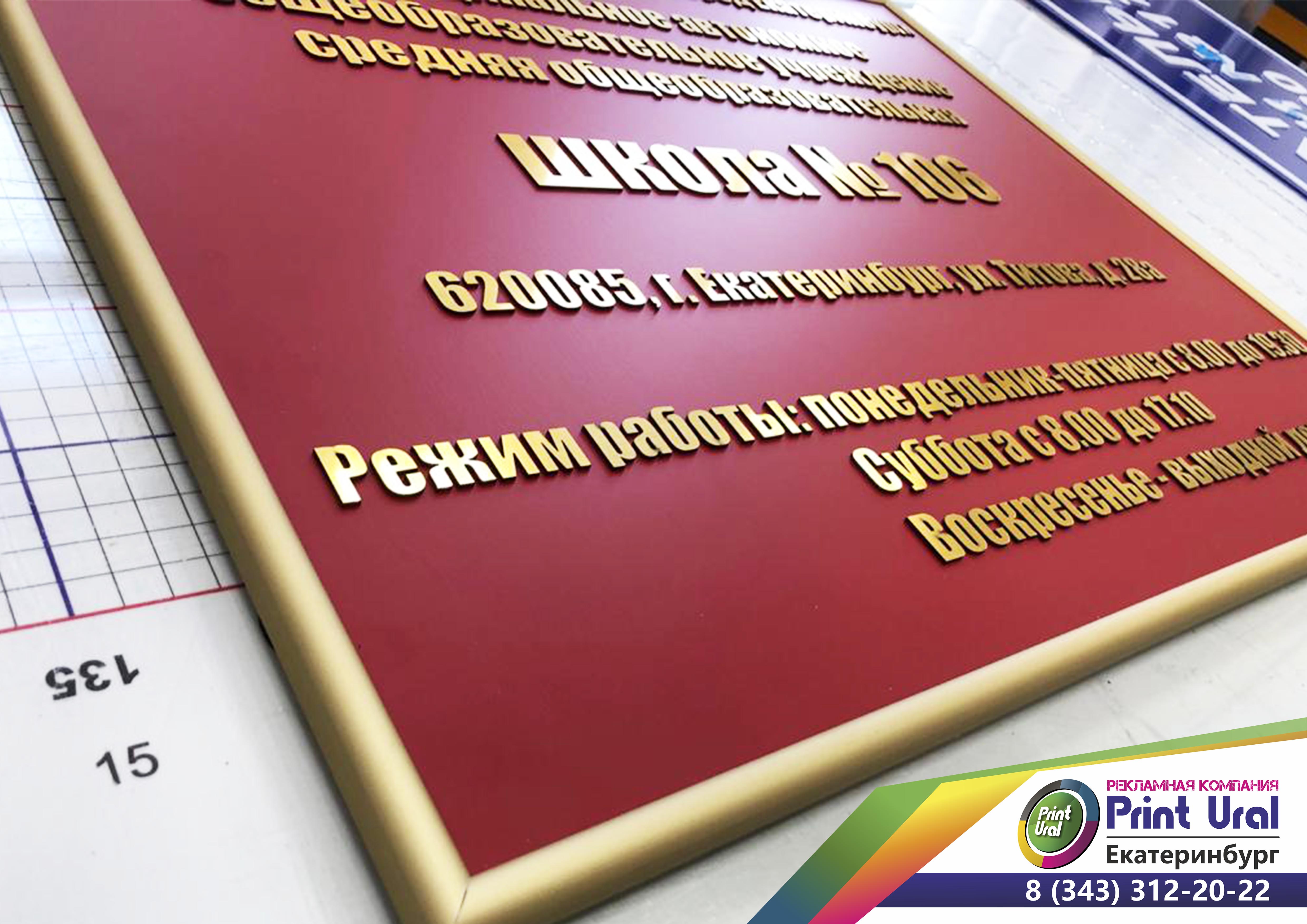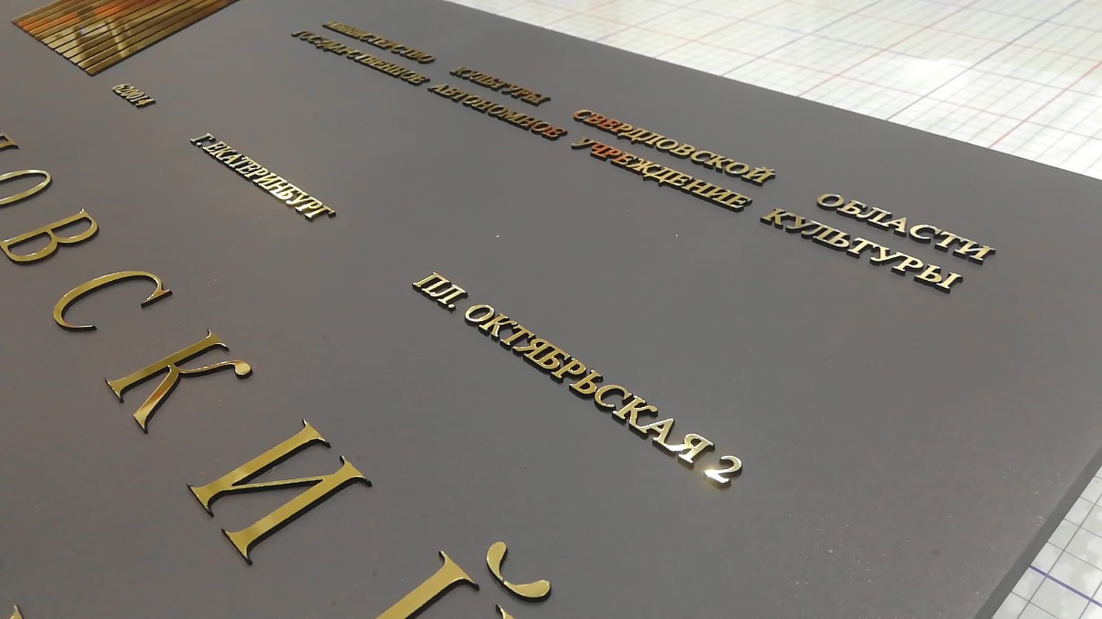 Табличка имеет основу алюминиевый композит, поверх нанесены зеркальные буквы с защитной пленкой, по периметру установлена алюминиевая рамка нельсон. На задней стороне имеются крючки.